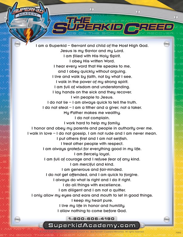 The Superkid Creed is one of the cornerstones of the Superkid Curriculum. Children memorize it, get it into their heart and find their life supercharged! Download it here for free. The Superkid Creed is also available for purchase as a window cling for $6. Click below and order today!